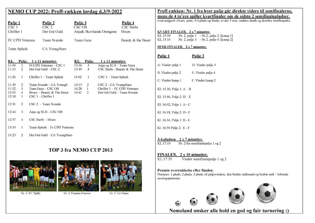 Nemolands legendariske fodboldturnering Nemo Cup er tilbage! Der er prof række lørdag d. 3 september og show række søndag d. 4 september… vi spiller på fredens eng, fredens ark lige ved Nemoland.