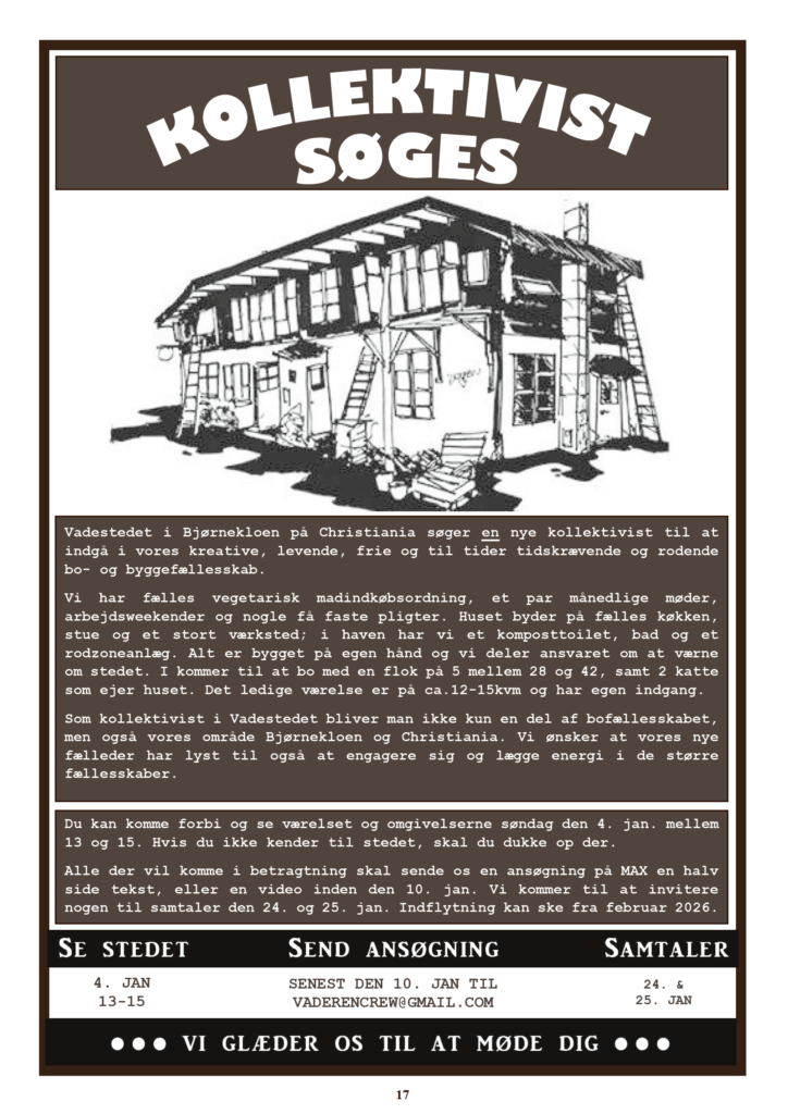 Området ønsker en beboer, som har lyst til at indgå og bidrage aktivt i området og på Christiania, da du som beboer er medlem af Foreningen Fristaden Christiania.